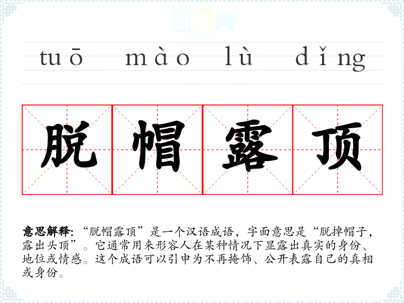 “脱帽露顶”是一个汉语成语,字面意思是“脱掉帽子,露出头顶”。它通常用来形容人在某种情况下显露出真实的身份、地位或情感。这个成语可以引申为不再掩饰、公开表露自己的真相或身份。