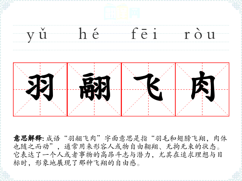 成语“羽翮飞肉”字面意思是指“羽毛和翅膀飞翔,肉体也随之而动”,通常用来形容人或物自由翱翔、无拘无束的状态。它表达了一个人或者事物的高昂斗志与潜力,尤其在追求理想与目标时,形象地展现了那种飞翔的自由感。