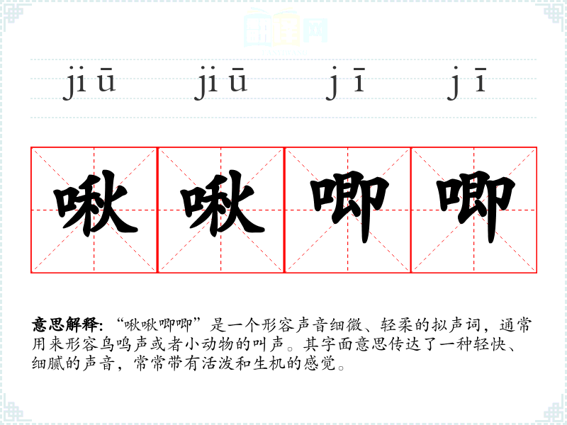 这个成语并没有特定的历史典故或文学出处,常见于描述自然界中*等动物的声音。它的构成是重复的拟声词,符合汉语中通过重复表达细腻情感和声音的惯。