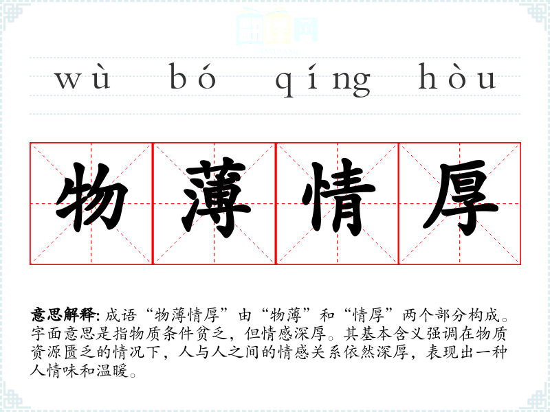 在*传统文化中,家庭和人际关系被视为非常重要的价值,物质条件并不是衡量人情的唯一标准。因此,“物情厚”反映了社会对情感的重视和对人际关系的期待。在现代社会,尽管物质条件普遍改善,但人们也越来越关注情感的缺失和内心的孤独,这个成语的内涵仍然具有重要的现实意义。