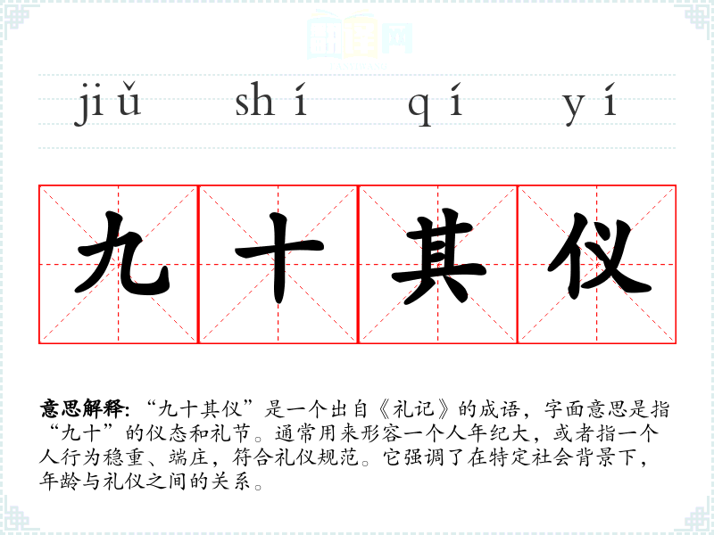 “九十其仪”是一个出自《礼记》的成语,字面意思是指“九十”的仪态和礼节。通常用来形容一个人年纪大,或者指一个人行为稳重、端庄,符合礼仪规范。它强调了在特定社会背景下,年龄与礼仪之间的关系。