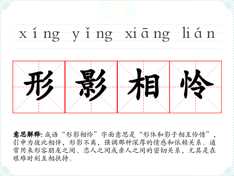 成语“形影相怜”字面意思是“形体和影子相互怜惜”,引申为彼此相伴,形影不离,强调那种深厚的情感和依赖关系。通常用来形容朋友之间、恋人之间或亲人之间的密切关系,尤其是在艰难时刻互相扶持。