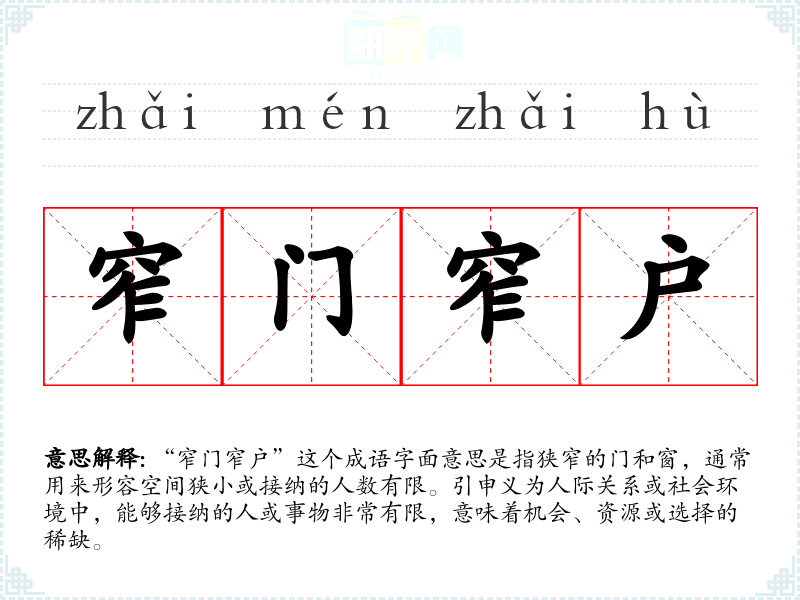 “窄门窄户”这个成语字面意思是指狭窄的门和窗,通常用来形容空间狭小或接纳的人数有限。引申义为人际关系或社会环境中,能够接纳的人或事物非常有限,意味着机会、资源或选择的稀缺。
