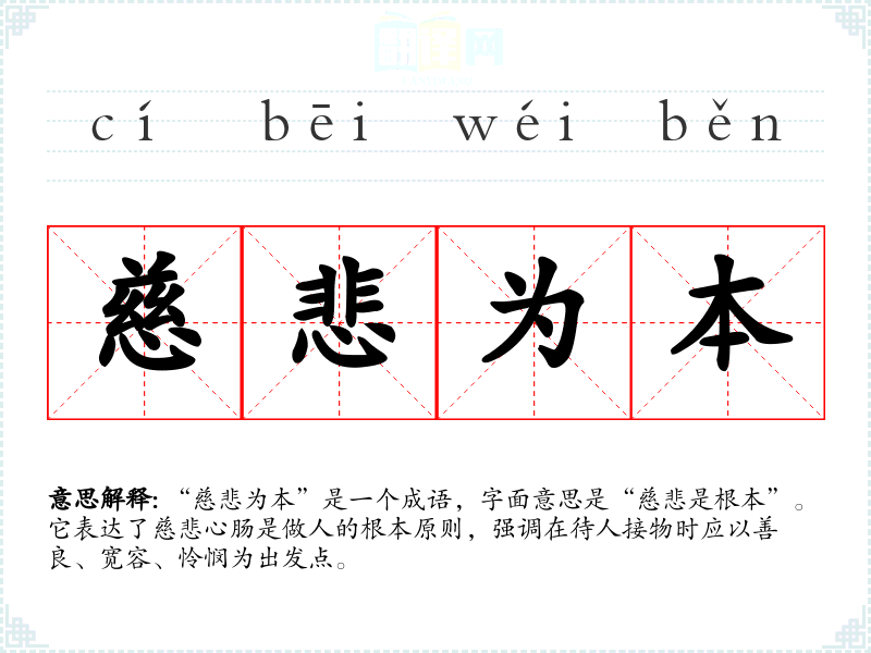 “慈悲为本”是一个成语,字面意思是“慈悲是根本”。它表达了慈悲心肠是做人的根本原则,强调在待人接物时应以善良、宽容、怜悯为出发点。