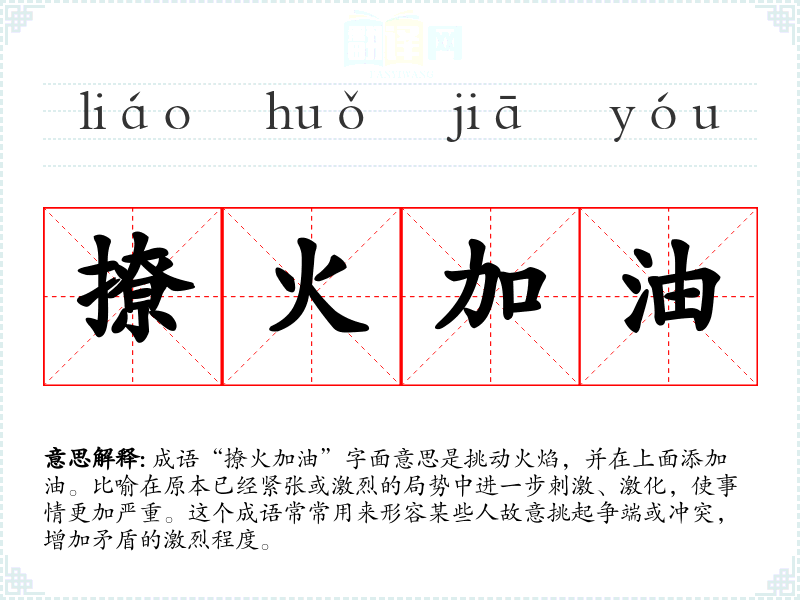 成语“撩火加油”字面意思是挑动火焰,并在上面添加油。比喻在原本已经紧张或激烈的局势中进一步刺激、激化,使事情更加严重。这个成语常常用来形容某些人故意挑起争端或冲突,增加矛盾的激烈程度。