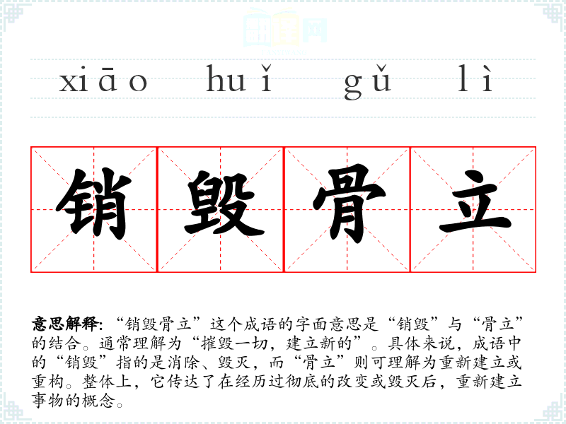 “销毁骨立”这个成语的字面意思是“销毁”与“骨立”的结合。通常理解为“摧毁一切,建立新的”。具体来说,成语中的“销毁”指的是消除、毁灭,而“骨立”则可理解为重新建立或重构。整体上,它传达了在经历过彻底的改变或毁灭后,重新建立事物的概念。