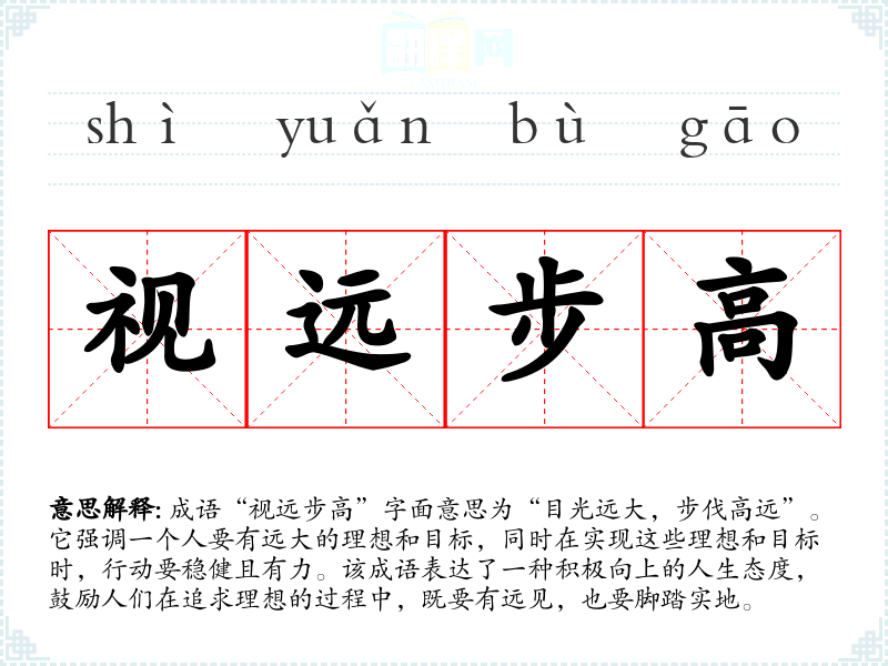 成语“视远步高”字面意思为“目光远大,步伐高远”。它强调一个人要有远大的理想和目标,同时在实现这些理想和目标时,行动要稳健且有力。该成语表达了一种积极向上的人生态度,鼓励人们在追求理想的过程中,既要有远见,也要脚踏实地。