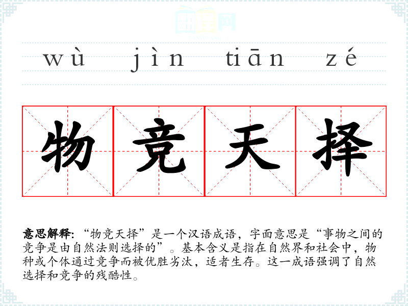 | 物竞天择 | 物竞:生物的生存竞争;天择:自然选择。生物相互竞争,能适应者生存下来。原指生物进化的一般规律,后也用于人类社会的发展。 |