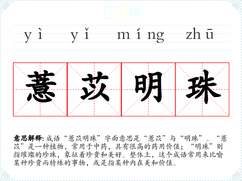 在**传统文化中,药材和珍珠都有着深厚的文化象征。薏苡在中医中被视为健康的象征,而明珠则代表着财富和美丽。成语的使用不仅反映了对美好事物的追求,也体现了对内在品质的重视。在现代社会,强调内在美与外在美的统一,依然具有重要的现实意义。