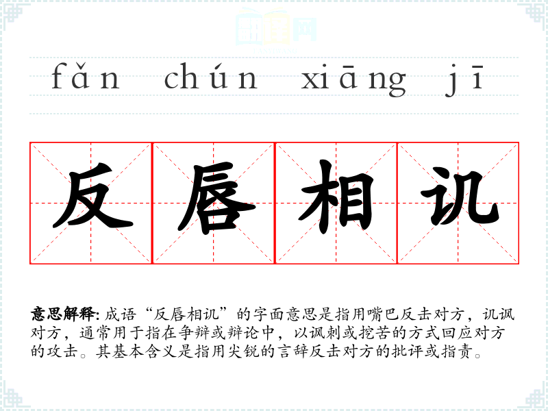 成语“反唇相讥”的字面意思是指用嘴巴反击对方,讥讽对方,通常用于指在争辩或辩论中,以讽刺或挖苦的方式回应对方的攻击。其基本含义是指用尖锐的言辞反击对方的批评或指责。