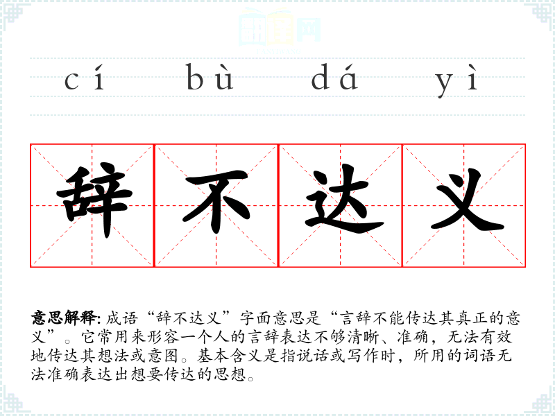 成语“辞不达义”字面意思是“言辞不能传达其真正的意义”。它常用来形容一个人的言辞表达不够清晰、准确,无法有效地传达其想法或意图。基本含义是指说话或写作时,所用的词语无法准确表达出想要传达的思想。