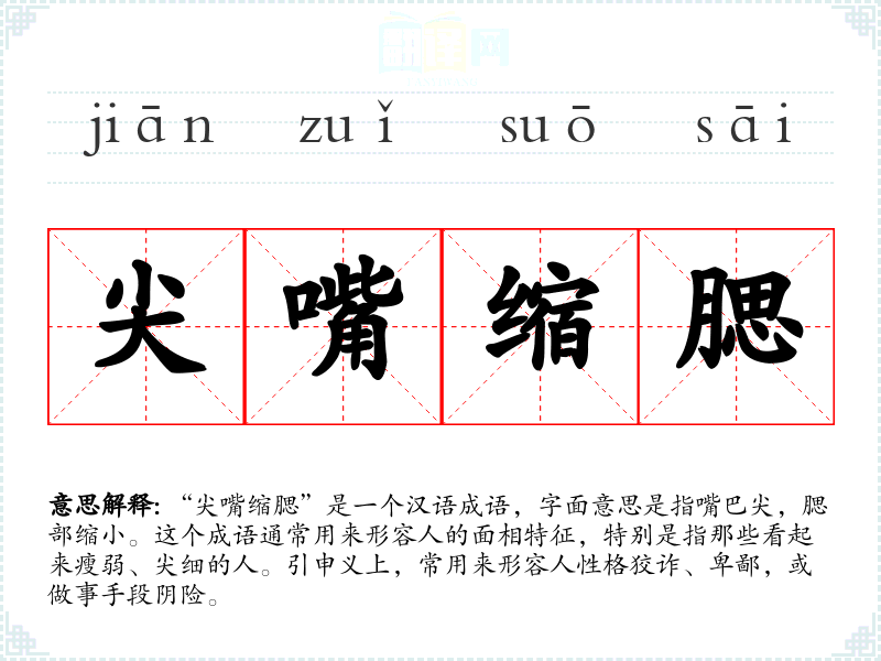 “尖嘴缩腮”是一个汉语成语,字面意思是指嘴巴尖,腮部缩小。这个成语通常用来形容人的面相特征,特别是指那些看起来瘦弱、尖细的人。引申义上,常用来形容人性格狡诈、卑鄙,或做事手段阴险。