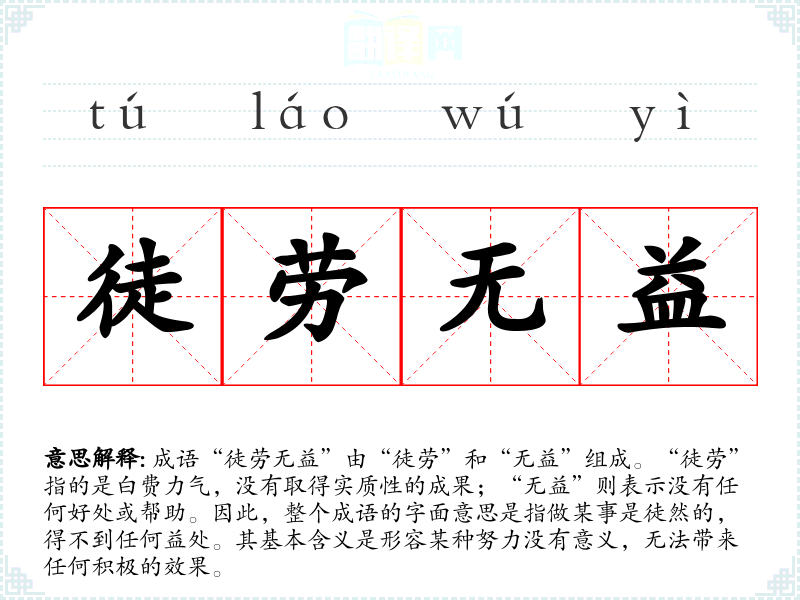 成语“徒劳无益”由“徒劳”和“无益”组成。“徒劳”指的是白费力气,没有取得实质性的成果;“无益”则表示没有任何好处或帮助。因此,整个成语的字面意思是指做某事是徒然的,得不到任何益处。其基本含义是形容某种努力没有意义,无法带来任何积极的效果。