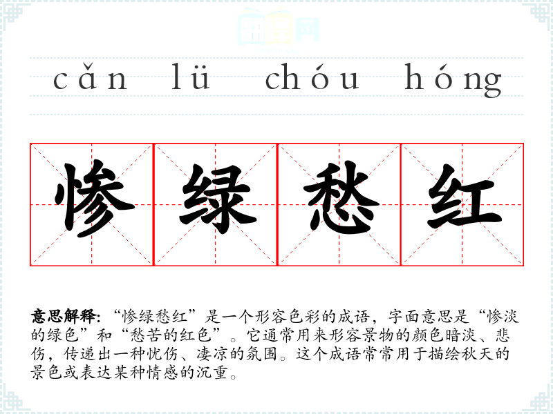 “惨绿愁红”是一个形容色彩的成语,字面意思是“惨淡的绿色”和“愁苦的红色”。它通常用来形容景物的颜色暗淡、悲伤,传递出一种忧伤、凄凉的氛围。这个成语常常用于描绘秋天的景色或表达某种情感的沉重。