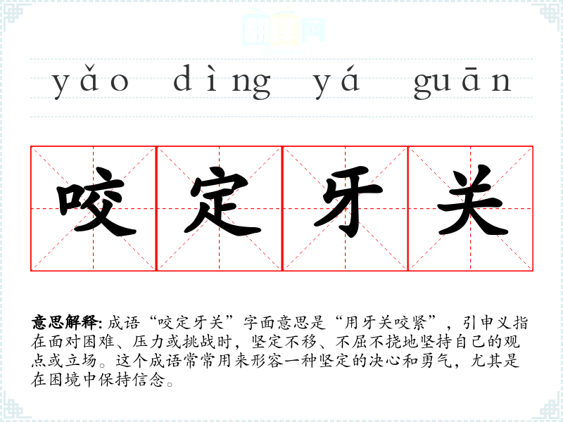 成语“咬定牙关”字面意思是“用牙关咬紧”,引申义指在面对困难、压力或挑战时,坚定不移、不屈不挠地坚持自己的观点或立场。这个成语常常用来形容一种坚定的决心和勇气,尤其是在困境中保持信念。