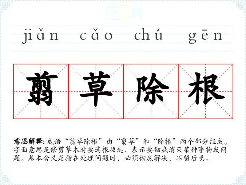 成语“翦草除根”由“翦草”和“除根”两个部分组成。字面意思是修剪草木时要连根拔起,表示要彻底消灭某种事物或问题。基本含义是指在处理问题时,必须彻底解决,不留后患。