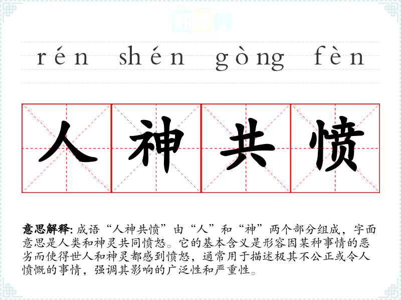 成语“人神共愤”由“人”和“神”两个部分组成,字面意思是人类和神灵共同愤怒。它的基本含义是形容因某种事情的恶劣而使得世人和神灵都感到愤怒,通常用于描述极其不公正或令人愤慨的事情,强调其影响的广泛性和严重性。