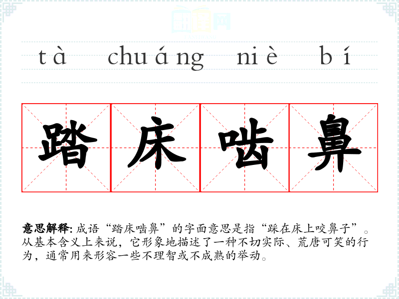 成语“踏床啮鼻”的字面意思是指“踩在床上咬鼻子”。从基本含义上来说,它形象地描述了一种不切实际、荒唐可笑的行为,通常用来形容一些不理智或不成熟的举动。