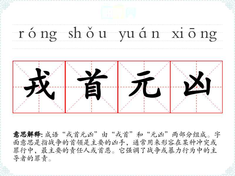 成语“戎首元凶”由“戎首”和“元凶”两部分组成。字面意思是指战争的首领是主要的凶手,通常用来形容在某种冲突或罪行中,最主要的责任人或首恶。它强调了战争或暴力行为中的主导者的罪责。