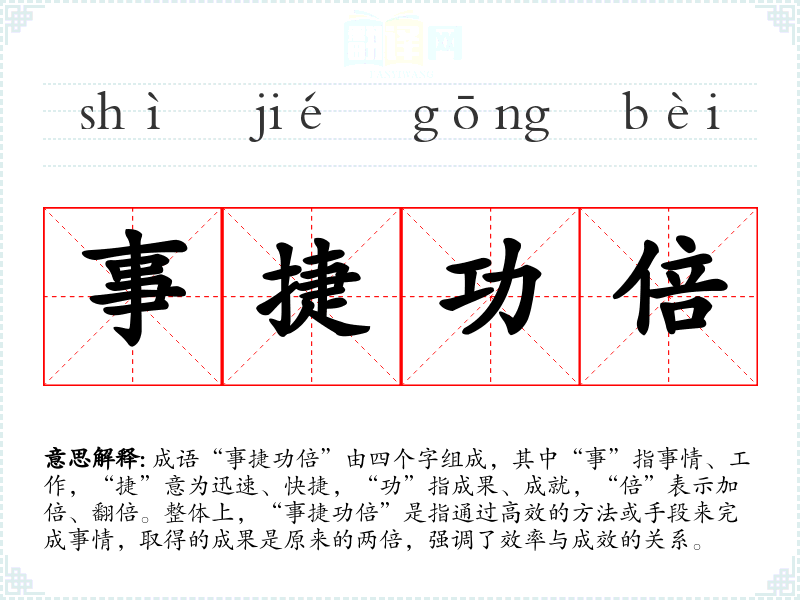成语“事捷功倍”由四个字组成,其中“事”指事情、工作,“捷”意为迅速、快捷,“功”指成果、成就,“倍”表示加倍、翻倍。整体上,“事捷功倍”是指通过高效的方法或手段来完成事情,取得的成果是原来的两倍,强调了效率与成效的关系。