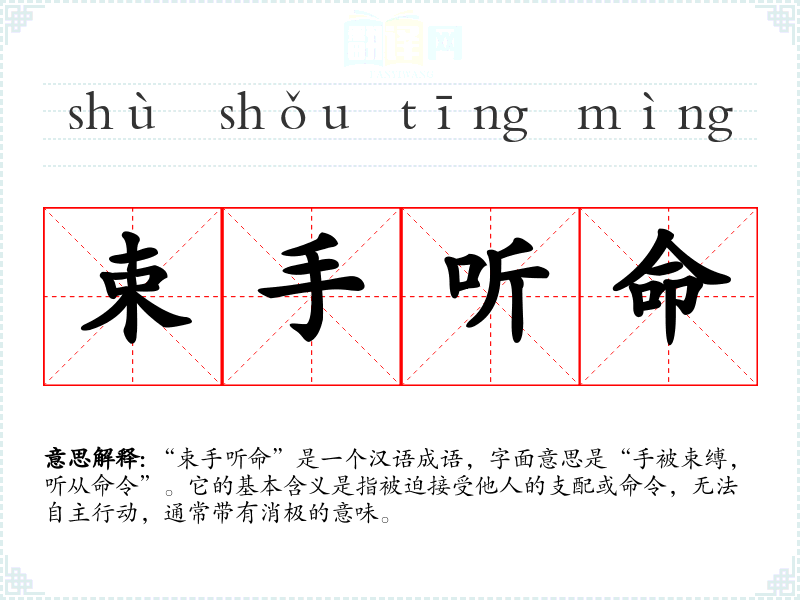 “束手听命”是一个汉语成语,字面意思是“手被束缚,听从命令”。它的基本含义是指被迫接受他人的支配或命令,无法自主行动,通常带有消极的意味。