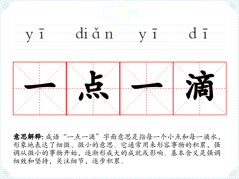 成语“一点一滴”字面意思是指每一个小点和每一滴水,形象地表达了细微、微小的意思。它通常用来形容事物的积累,强调从微小的事物开始,逐渐形成大的成就或影响。基本含义是强调细致和坚持,关注细节,逐步积累。