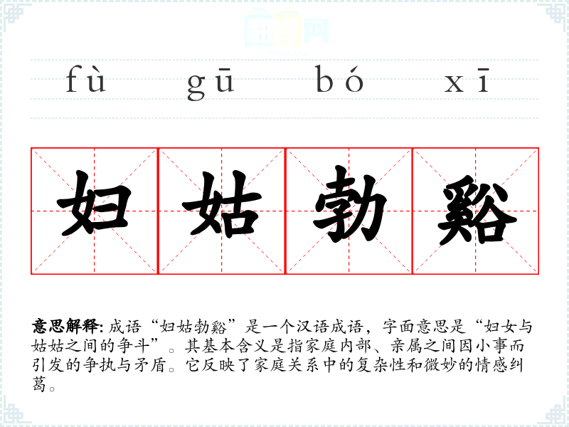 成语“妇姑勃谿”是一个汉语成语,字面意思是“妇女与姑姑之间的争斗”。其基本含义是指家庭内部、亲属之间因小事而引发的争执与矛盾。它反映了家庭关系中的复杂性和微妙的情感纠葛。