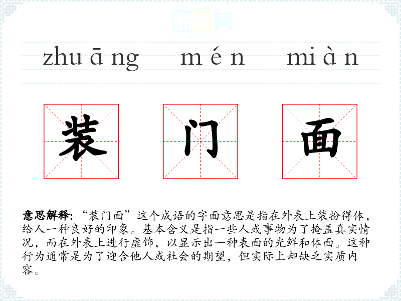 “装门面”这个成语的字面意思是指在外表上装扮得体,给人一种良好的印象。基本含义是指一些人或事物为了掩盖真实情况,而在外表上进行虚饰,以显示出一种表面的光鲜和体面。这种行为通常是为了迎合他人或社会的期望,但实际上却缺乏实质内容。