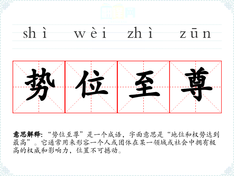 “势位至尊”是一个成语,字面意思是“地位和权势达到最高”。它通常用来形容一个人或团体在某一领域或社会中拥有极高的权威和影响力,位置不可撼动。