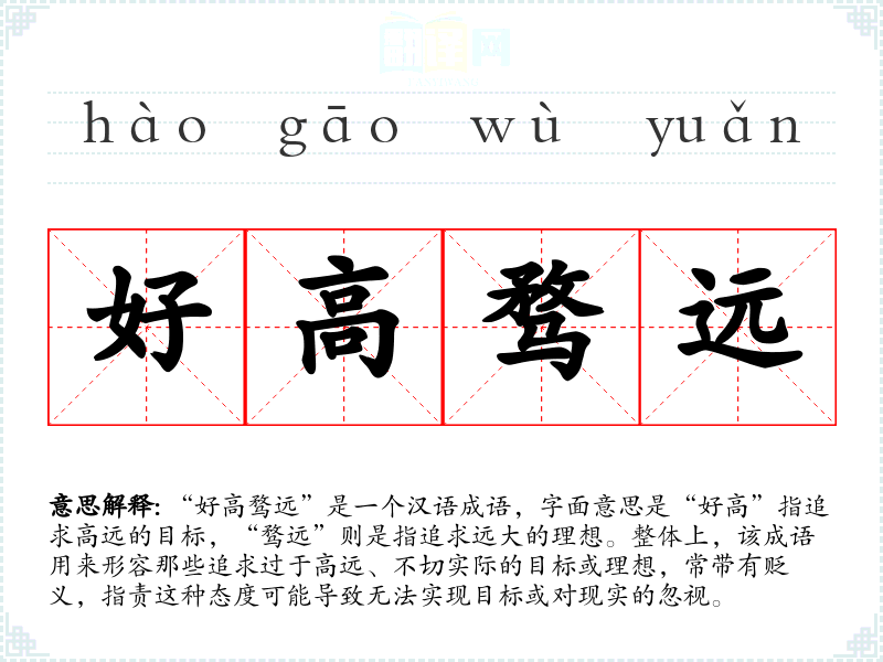“好高骛远”是一个汉语成语,字面意思是“好高”指追求高远的目标,“骛远”则是指追求远大的理想。整体上,该成语用来形容那些追求过于高远、不切实际的目标或理想,常带有贬义,指责这种态度可能导致无法实现目标或对现实的忽视。