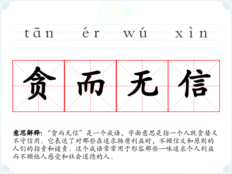 “贪而无信”是一个成语,字面意思是指一个人既贪婪又不守信用。它表达了对那些在追求物质利益时,不顾信义和原则的人们的指责和谴责。这个成语常常用于形容那些一味追求个人利益而不顾他人感受和社会道德的人。