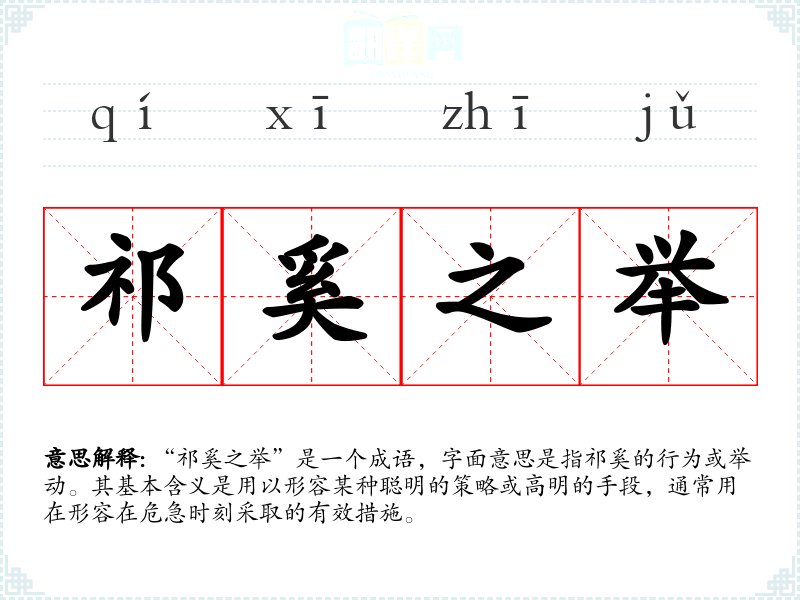 “祁奚之举”源于**古代历史人物祁奚,他是春秋时期晋国的著名政治家,以智谋和才能闻名。传说他在处理政务时,常常能够运用巧妙的办法化解危机,取得成功,因此后人用“祁奚之举”来形容这种聪明的策略或应对方式。