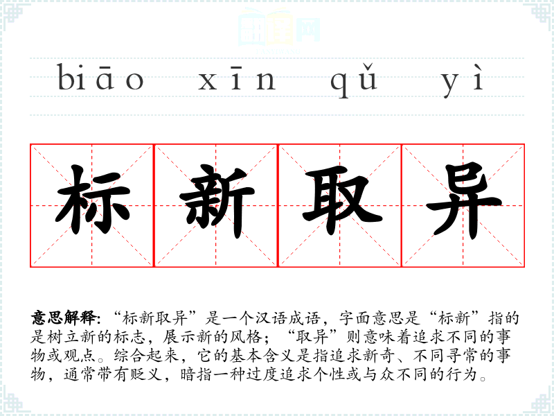 “标新取异”是一个汉语成语,字面意思是“标新”指的是树立新的标志,展示新的风格;“取异”则意味着追求不同的事物或观点。综合起来,它的基本含义是指追求新奇、不同寻常的事物,通常带有贬义,暗指一种过度追求个性或与众不同的行为。