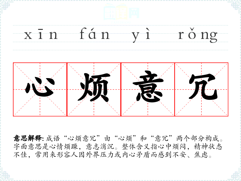 成语“心烦意冗”并没有明确的历史典故或文学出处,它是由汉语的常用词汇构成的一个较为口语化的表达。从词语的构成来看,“心烦”指心中烦闷,“意冗”指意志消沉,合在一起便形成了对一种心理状态的描述,反映出人们在生活中对情绪的普遍感受。