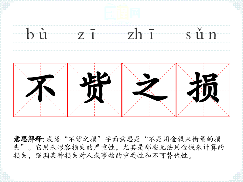 成语“不赀之损”字面意思是“不是用金钱来衡量的损失”。它用来形容损失的严重性,尤其是那些无法用金钱来计算的损失,强调某种损失对人或事物的重要性和不可替代性。