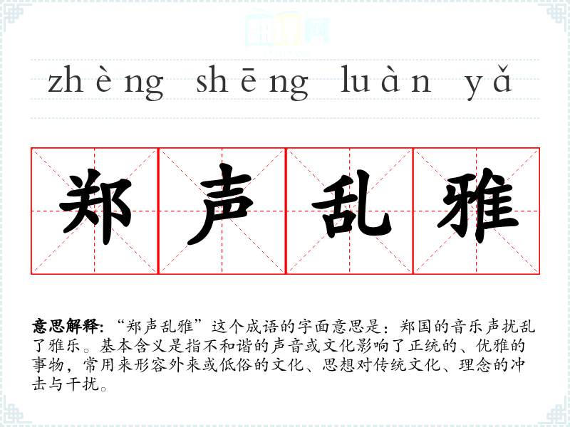 “郑声乱雅”这个成语的字面意思是:郑国的音乐声扰乱了雅乐。基本含义是指不和谐的声音或文化影响了正统的、优雅的事物,常用来形容外来或低俗的文化、思想对传统文化、理念的冲击与干扰。