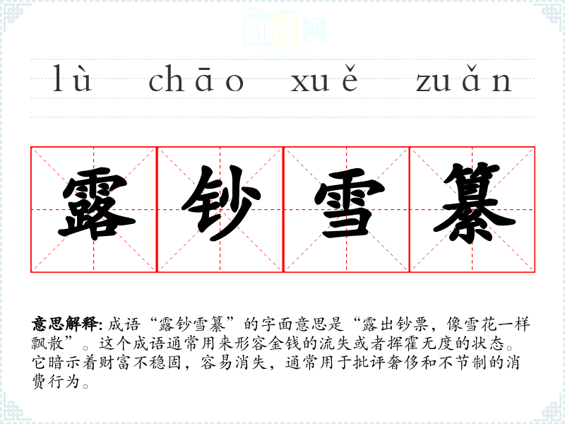成语“露钞雪纂”的字面意思是“露出钞票,像雪花一样飘散”。这个成语通常用来形容金钱的流失或者挥霍无度的状态。它暗示着财富不稳固,容易消失,通常用于批评奢侈和不节制的消费行为。