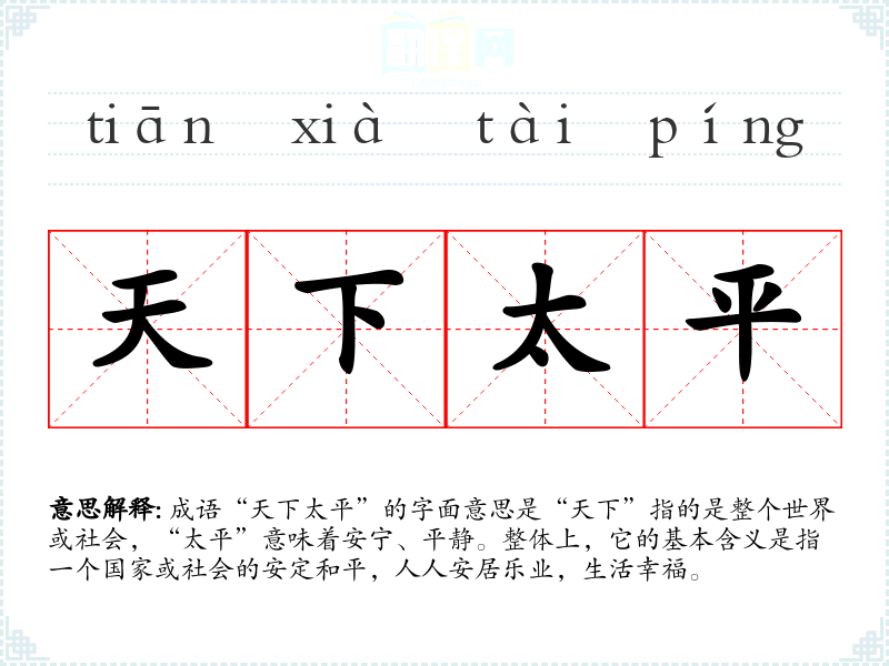 成语“天下太平”的字面意思是“天下”指的是整个世界或社会,“太平”意味着安宁、平静。整体上,它的基本含义是指一个国家或社会的安定和平,人人安居乐业,生活幸福。