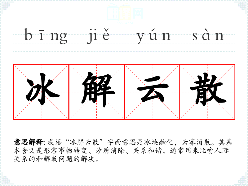 成语“冰解云散”字面意思是冰块融化,云雾消散。其基本含义是形容事物转变、矛盾消除、关系和谐,通常用来比喻人际关系的和解或问题的解决。