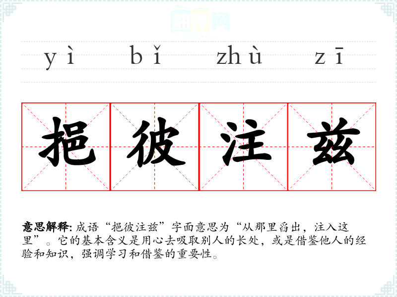 成语“挹彼注兹”字面意思为“从那里舀出,注入这里”。它的基本含义是用心去吸取别人的长处,或是借鉴他人的经验和知识,强调学*和借鉴的重要性。