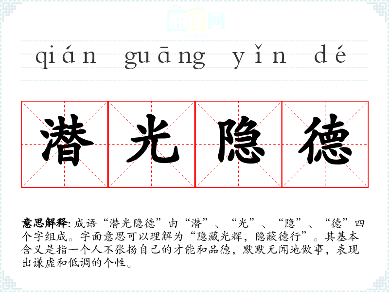 成语“潜光隐德”由“潜”、“光”、“隐”、“德”四个字组成。字面意思可以理解为“隐藏光辉,隐蔽德行”。其基本含义是指一个人不张扬自己的才能和品德,默默无闻地做事,表现出谦虚和低调的个性。