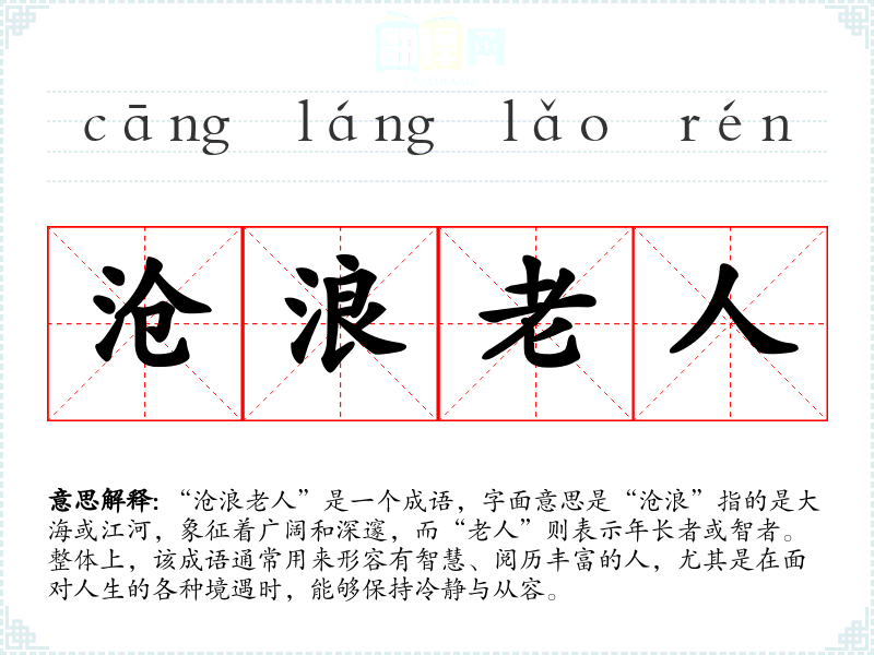“沧浪老人”是一个成语,字面意思是“沧浪”指的是大海或江河,象征着广阔和深邃,而“老人”则表示年**或智者。整体上,该成语通常用来形容有智慧、阅历丰富的人,尤其是在面对人生的各种境遇时,能够保持冷静与从容。