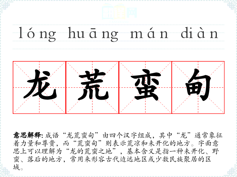成语“龙荒蛮甸”由四个汉字组成,其中“龙”通常象征着力量和尊贵,而“荒蛮甸”则表示荒凉和未开化的地方。字面意思上可以理解为“龙的荒蛮之地”,基本含义是指一种未开化、野蛮、落后的地方,常用来形容古代边远地区或少数民族聚居的区域。