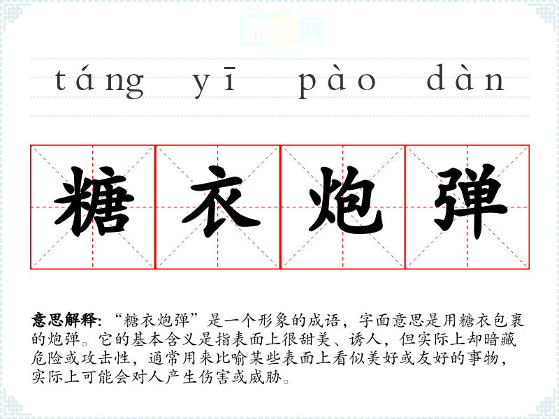 “糖衣炮弹”是一个形象的成语,字面意思是用糖衣包裹的炮弹。它的基本含义是指表面上很甜美、诱人,但实际上却暗藏危险或攻击性,通常用来比喻某些表面上看似美好或友好的事物,实际上可能会对人产生伤害或威胁。