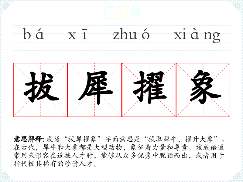 成语“拔犀擢象”字面意思是“拔取犀牛,擢升大象”。在古代,犀牛和大象都是大型动物,象征着力量和尊贵。该成语通常用来形容在选拔人才时,能够从众多优秀中脱颖而出,或者用于指代极其稀有的珍贵人才。