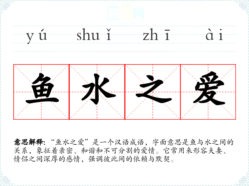 “鱼水之爱”是一个汉语成语,字面意思是鱼与水之间的关系,象征着亲密、和谐和不可分割的爱情。它常用来形容夫妻、情侣之间深厚的感情,强调彼此间的依赖与默契。