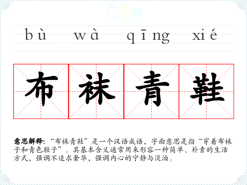 “布袜青鞋”是一个汉语成语,字面意思是指“穿着布袜子和青色鞋子”。其基本含义通常用来形容一种简单、朴素的生活方式,强调不追求奢华,强调内心的宁静与淡泊。
