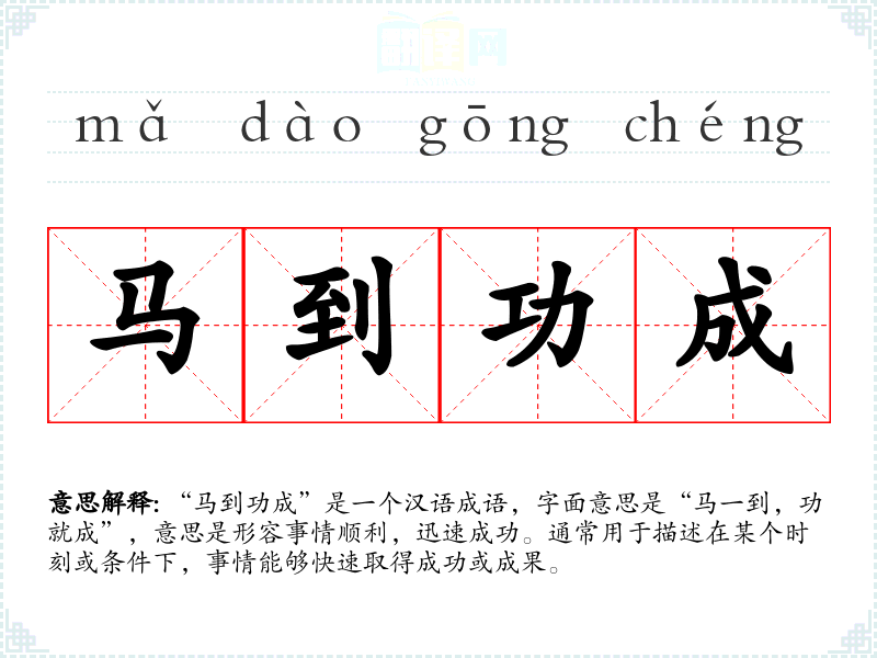 “马到功成”是一个汉语成语,字面意思是“马一到,功就成”,意思是形容事情顺利,迅速成功。通常用于描述在某个时刻或条件下,事情能够快速取得成功或成果。