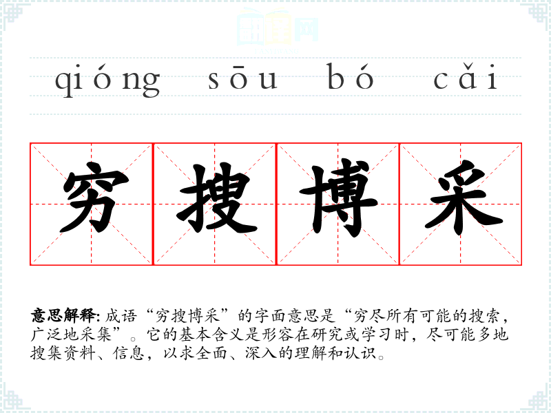 “穷搜博采”源于古代的求知和学术追求,强调全面性和深入性。虽然具体出处不详,但类似的表达在古代文人的学*和研究中常见,反映了*传统文化对知识积累和学态度的重视。