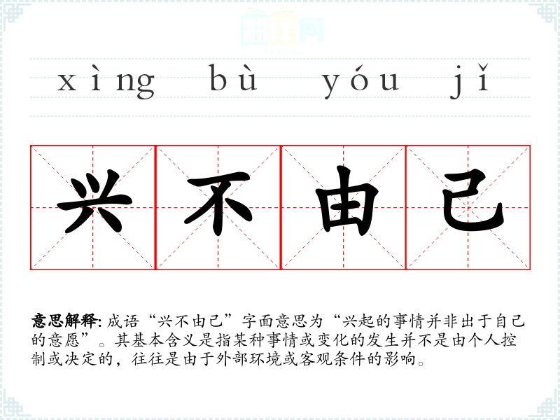 成语“兴不由己”字面意思为“兴起的事情并非出于自己的意愿”。其基本含义是指某种事情或变化的发生并不是由个人控制或决定的,往往是由于外部环境或客观条件的影响。